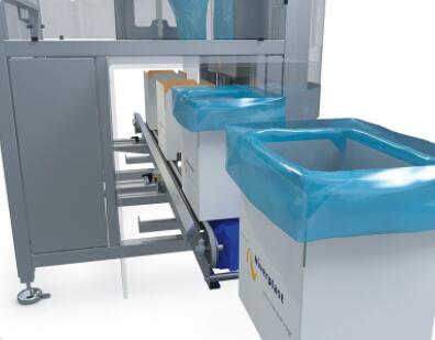 在箱子傳送過程中,預制的袋子由真空夾具抓起。